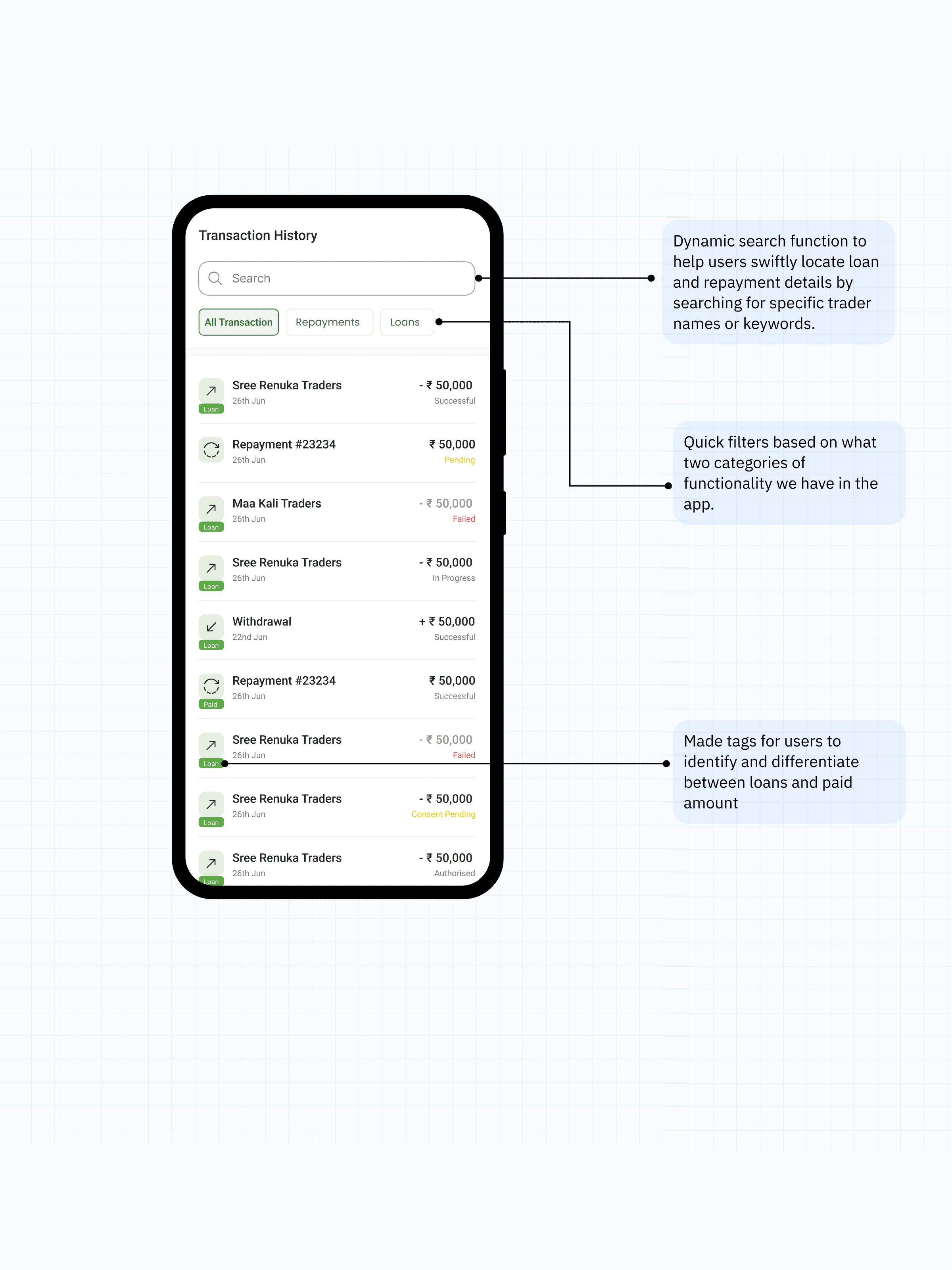 We added a dynamic search function to help users swiftly locate loan and repayment details by searching for specific trader names or keywords. Drawing from user behavior in other apps, this feature aims to streamline information retrieval.