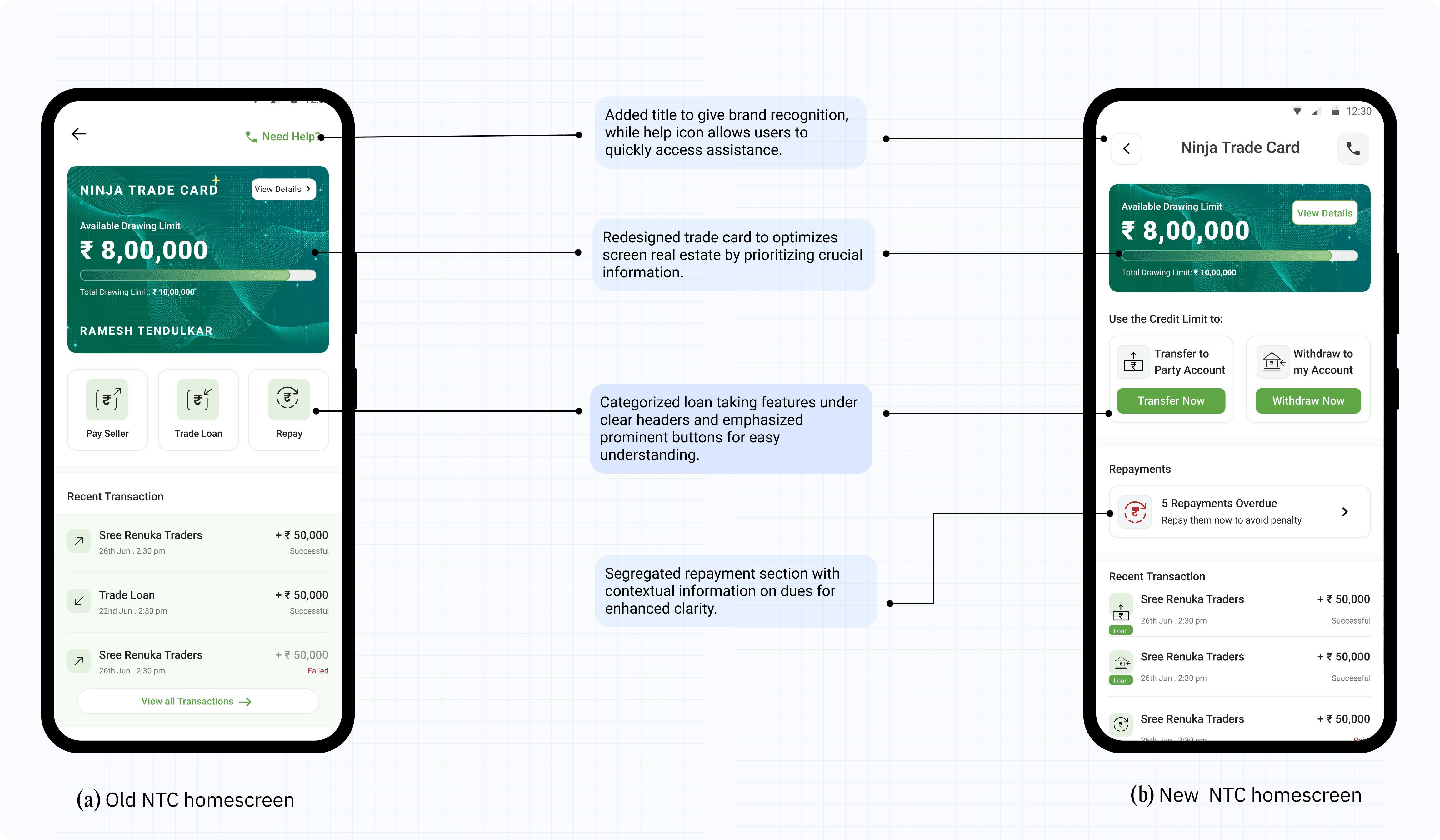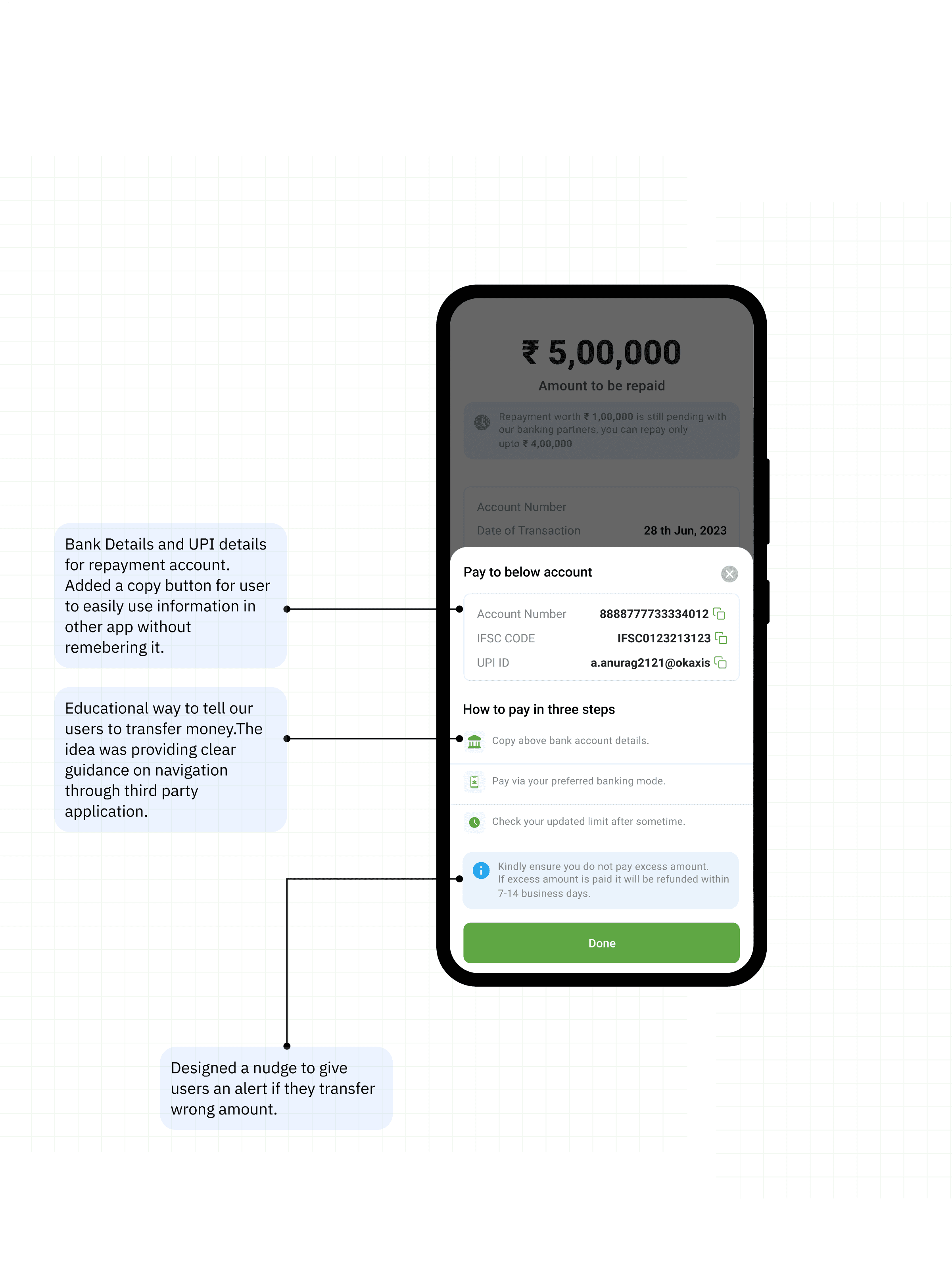 Clear Call-to-Action: By using a prominent button within the alert, we provided users with a direct entry point to the repayment section. This not only streamlined the user journey but will also empower users to proactively manage their due repayments.