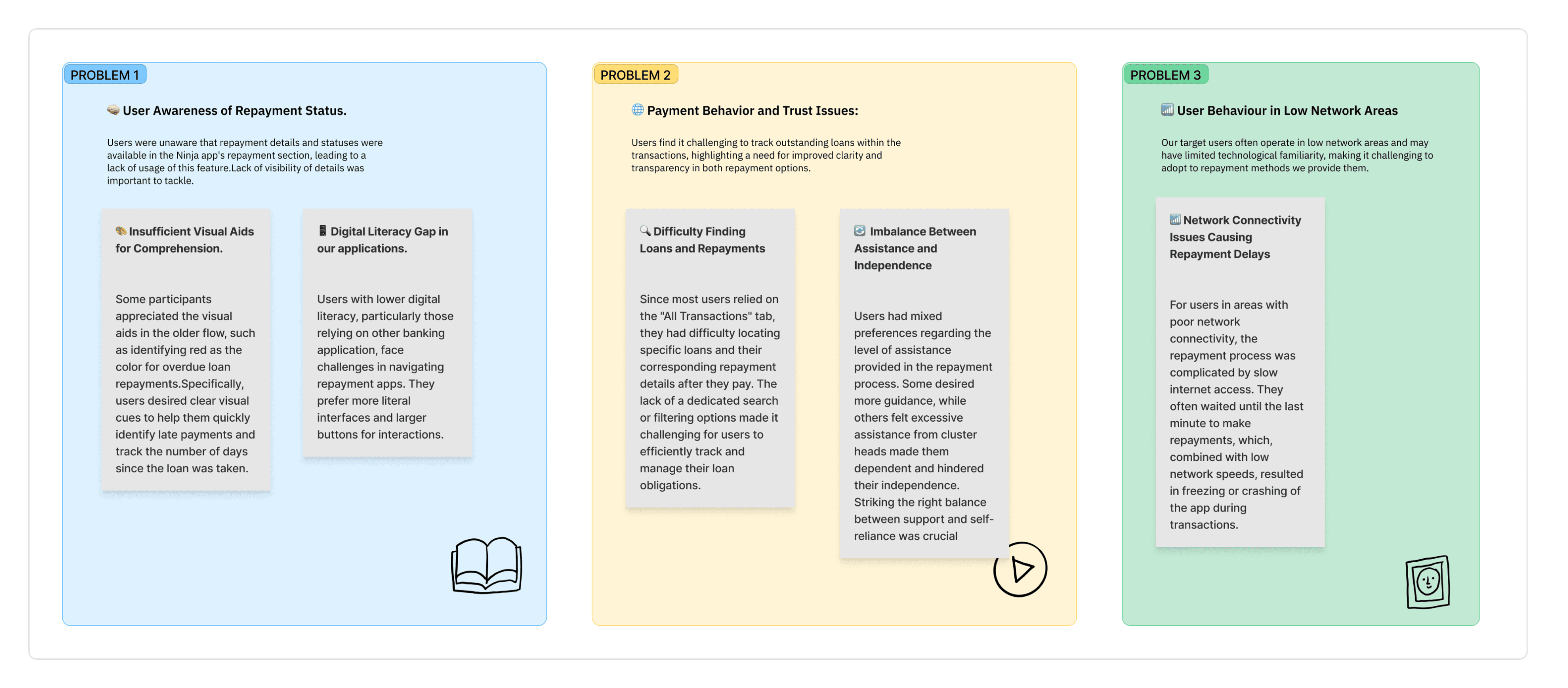 Through conversations, I listened intently as they shared their experiences and frustrations. It became evident that there were several hurdles hindering smooth loan repayment processes.The goal was to gather qualitative insights that could guide design improvements to our repayment process and make it more user-friendly.